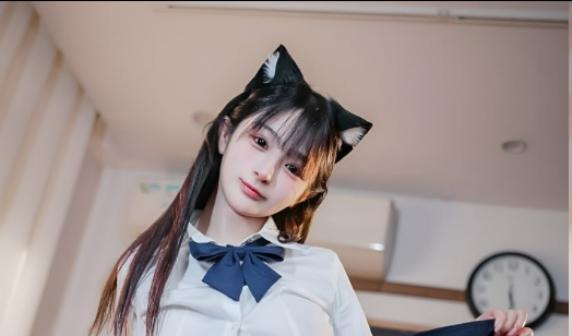 她身穿简洁却精致的白色衬衫,领口系着醒目的蓝色蝴蝶结,下身搭配同色系的蓝色百褶短裙,身后还轻轻摇曳着一根毛茸茸的猫尾巴。在柔和的灯光映照下,她的肌肤显得格外细腻光滑。时而面对镜头轻展笑颜,时而摆出各种极富张力的拍摄姿势,让观者不由自主地被吸引。