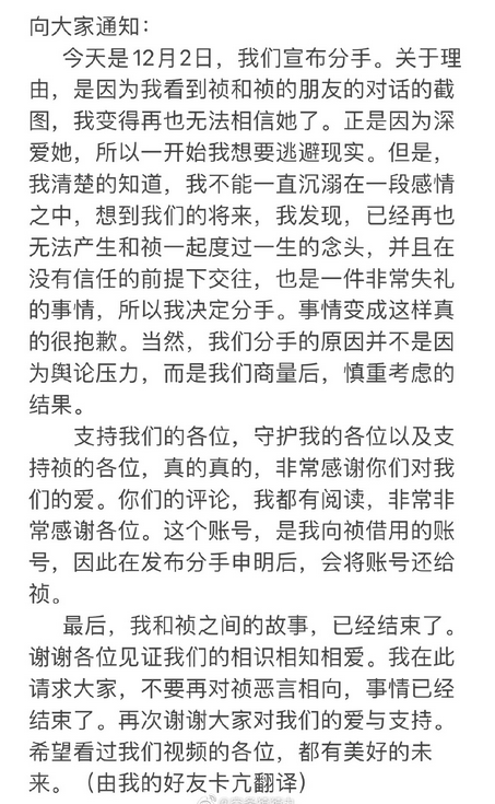 谢谢各位祝福她和为她讲过话的人。很遗憾她们不能再继续下去了。