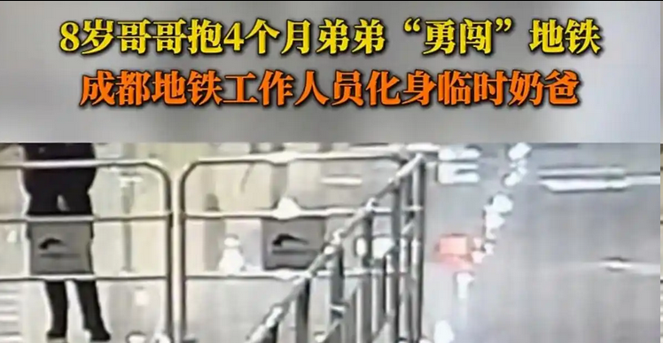 在成都地铁东光站的熙攘人流中,出现了一个极不协调的画面:一个年仅8岁的身形,怀里竟然横抱着一个才4个月大的小婴儿。画面里,8岁的小哥哥虽然步伐还算稳健,但明显有些吃力,怀里的襁褓看起来摇摇欲坠。幸亏地铁工作人员眼疾手快,发现不对劲后赶紧上前“接盘”。
