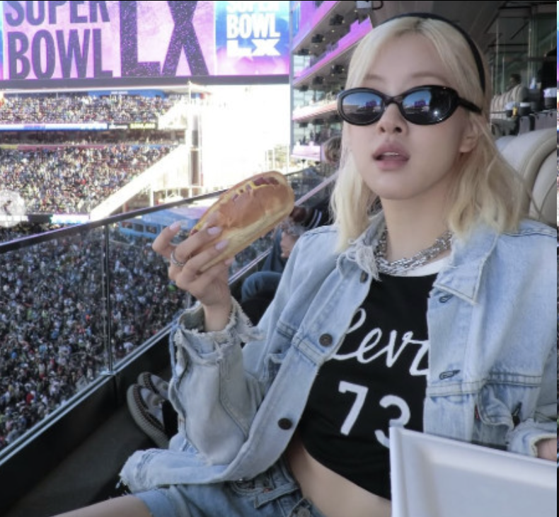 在公开的照片中,Rosé 正在美国加利福尼亚州圣克拉拉的列维体育场观看超级碗决赛。她身穿露脐内搭,巧妙叠穿浅蓝色牛仔外套和中蓝色牛仔短裙,散发出干练而时尚的气息。照片中她手拿热狗肠面包和饮料、沉浸在比赛中的模样,吸引了众多粉丝的目光。